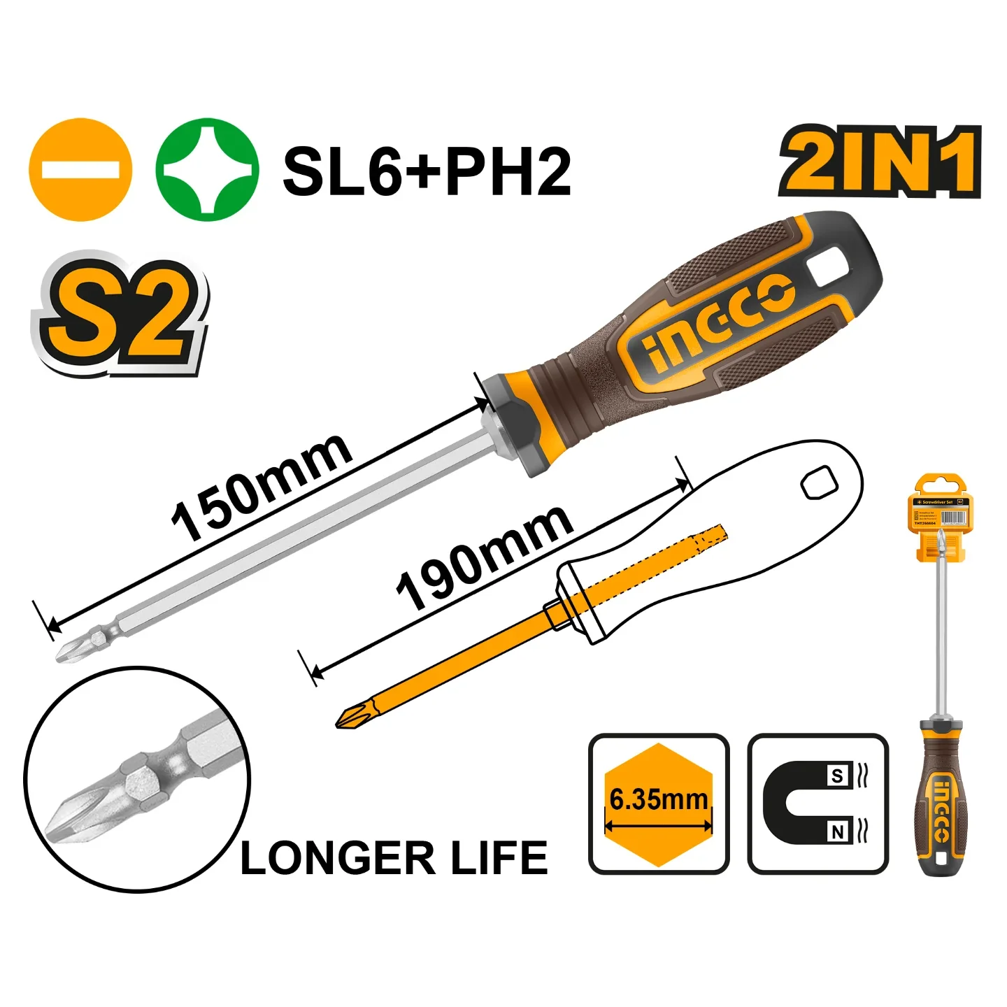 | 2 IN 1 Screwdriver set Shank size:6.35*192mm Blade exposed length:150mm Tip type:PH2+SL6 Material:S2 Impact blade design for long life With 1pcs interchangeable handle Packed by plastic hanger |