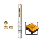| Voltage:220-240V~50Hz Rated power:550W(0.75HP) Max.head:64m Max.flow:6.7m³/h Pipe diameter:1-1/4″ Well pump body:4″ Impeller:8 stage Copper wire motor Outlet :Brass Inlet: Brass Oil chamber: Brass Pump body:Stainless steel 20m length cable 1pcs control box Packed by carton box |