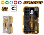 | 55 Pcs screwdriver set Include: 21Pcs 6.35X25mm screwdriver bits:SL4 SL5 SL6 PH1 PH2 PH2 PH2 PH3 PZ1 PZ2 PZ3 T10 T15 T20 T25 T30 T40 H3 H4 H5 H6 20Pcs 4X28mm precision screwdriver bits: SL1.5 SL2 SL2.5 SL3 PH000 PH00 PH0 PH1 T6 T7 T8 T9 T10 T15 T20 H1.5 H2.0 H2.5 H3.0 H4.0 1Pcs 4-6mm(25mm)bits adaptor 9Pcs 1/4″X20.5mm socket:4mm 5mm 6mm 7mm 8mm 9mm 10mm 11mm 12mm 1Pcs 4X60mm bits holder 1Pcs 6.35X50mm bits holder 1Pcs Unique design ratchet handle 1Pcs unique design handle Packed by plastic box |