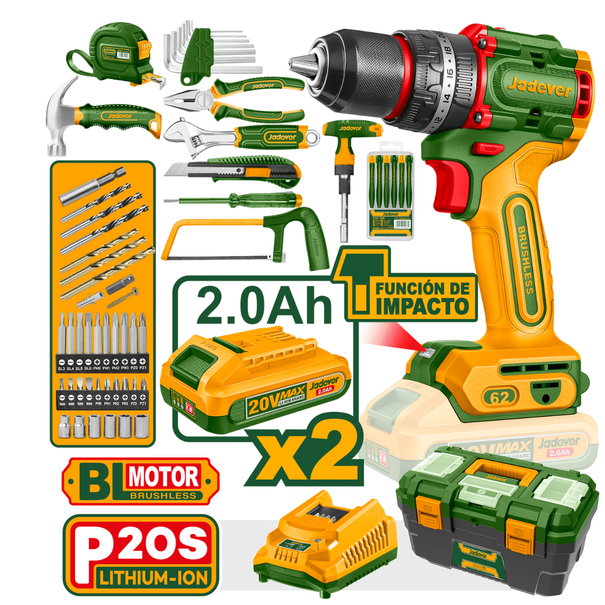 Jadever Compact Brushless Cordless Impact Drill 62Nm 20V