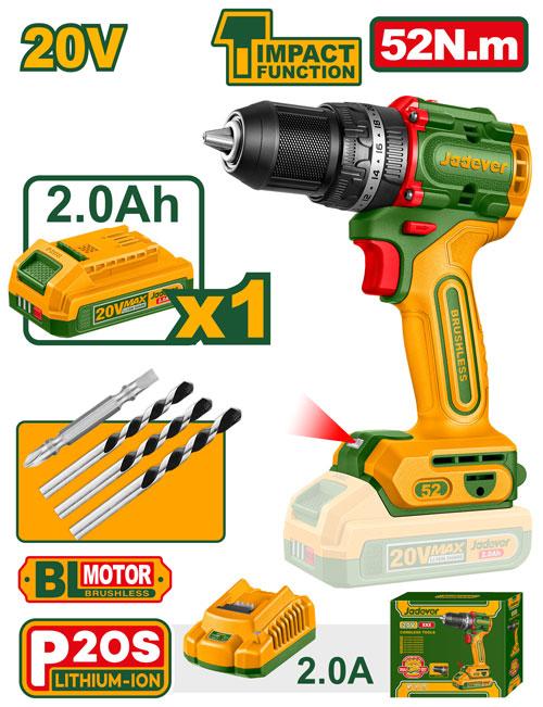 Jadever Compact Brushless Cordless Impact Drill 52Nm 20V