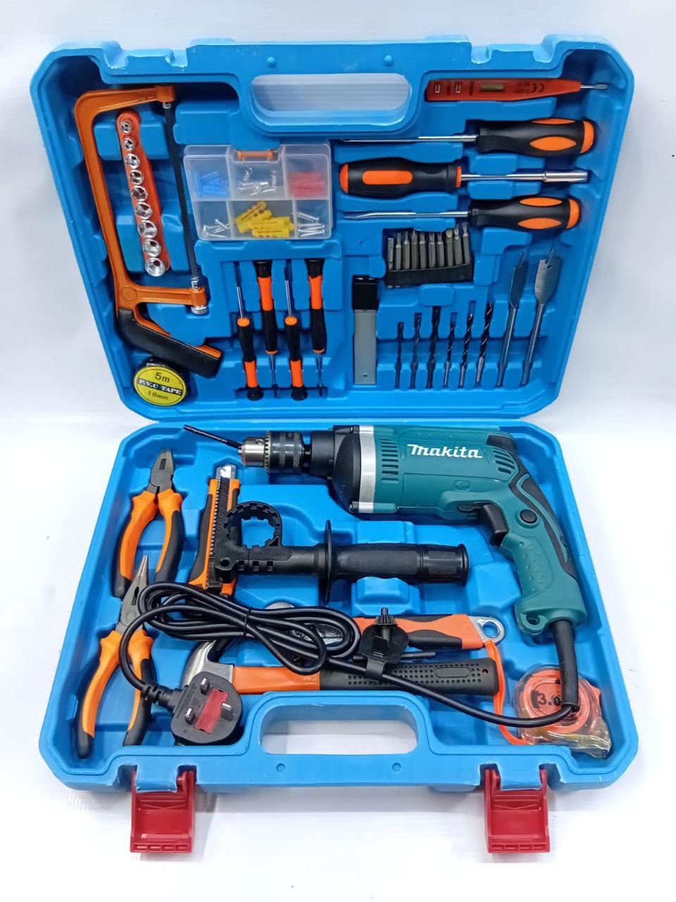 The Drill: The set is often built around the Makita HP1630 (or a similar model), which is a powerful, corded impact/hammer drill.